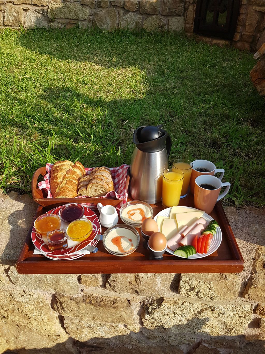 Καθημερινά σερβίρουμε πρωινό Room service στο ηλιόλουστο μπαλκόνι η την βεράντα σας , όπου θα έχετε την δυνατότητα να δοκιμάσετε τις χειροποίητες μαρμελάδες μας, το φρέσκο ζυμωτό ψωμί από τον φούρνο του χωριού και το μέλι από την τοπική κοινότητα της Χαλκιδικής. Επιπλέον μπορείτε να γευτείτε το βιολογικό μας τσάι που μαζεύουμε από τα βουνά της περιοχής μας.